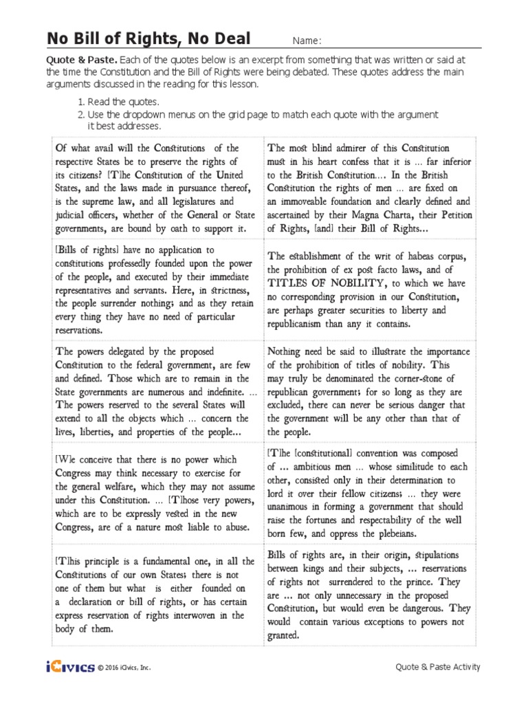 Bill of Rights helping students to identify among other things the five key freedoms embedded in the First Amendment and the purpose of the Ninth and Tenth No bill of rights no deal answer key. Students will find out why individual rights was such a big issue where the concept of a bill of rights came fromand how the Bill of Rights finally got added to the U. The name for people who opposed the Constitution partly because it had no bill of rights.